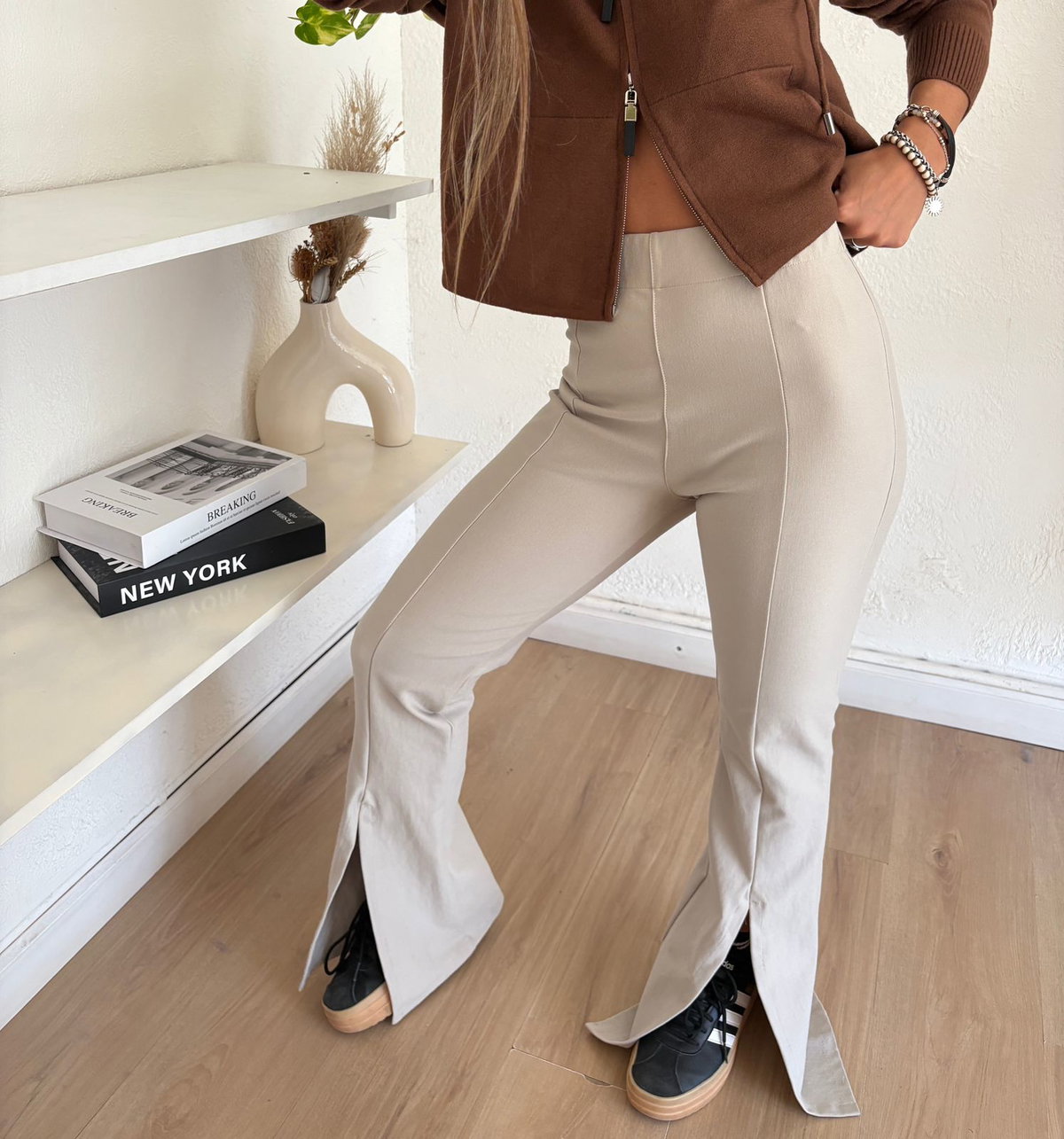 Pantalon tiro alto diseñado para estilizar la silueta con un calce ajustado que se adapta comodamente al cuerpo. Destaca por sus tajos frontales en el bajo, un detalle moderno que alarga visualemente las piernas y suma un toque sofisticado.